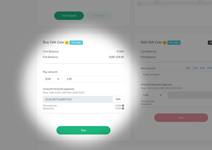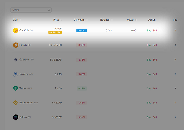 Once login, find OJA Coin the cryptocurrency list and hit Buy